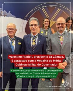 No último dia 2 de dezembro, no auditório JK, na Cidade Administrativa, o presidente da Câmara, Valentino Rizzioli, foi condecorado