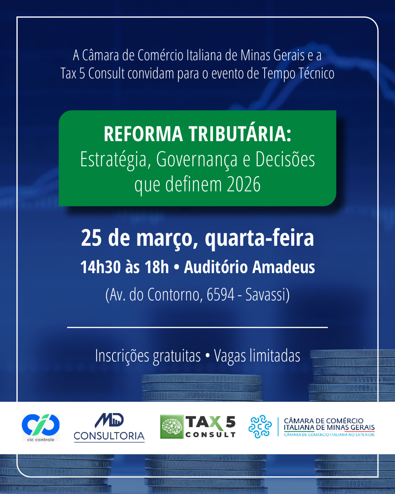 🇮🇹💲🇧🇷 CONVITE – A Câmara de Comércio Italiana de Minas Gerais e a Tax 5 Consult convidam para o evento de Tempo Técnico “Reforma Tributária: Estratégia, Governança e Decisões que definem 2026”.