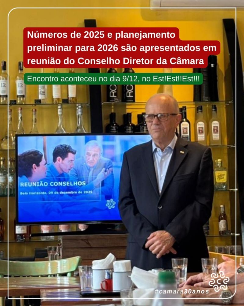 Os números e a natureza de atividades e iniciativas da entidade em 2025, ano que que a Câmara celebrou 30 anos de fundação, foram apresentados, na última terça-feira, dia 9/12, na reunião do Conselho Diretor da Câmara, que aconteceu no restaurante Est!Est!!Est!!!