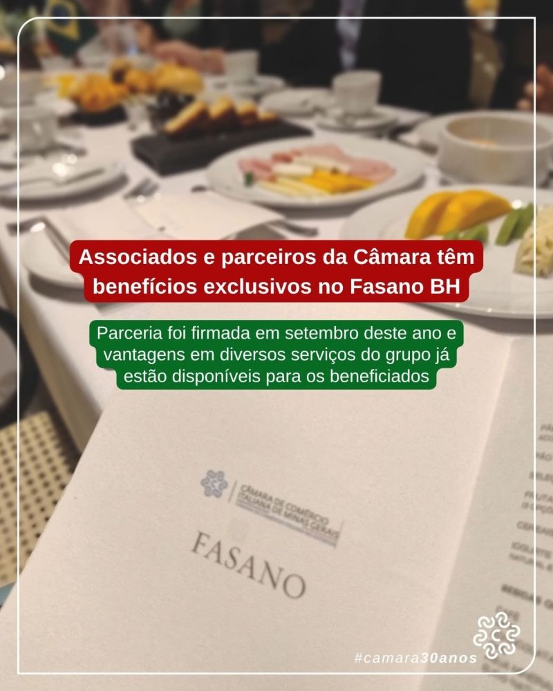 Em setembro deste ano, a Câmara firmou parceria com o Hotel Fasano BH, que agora oferece benefícios exclusivos para empresas associadas e parceiros da entidade. Dentre o rol de vantagens disponibilizadas, há opções de tarifas diferenciadas e condições especiais, tanto para hospedagem quanto para aluguel de espaços para eventos de naturezas diversas.